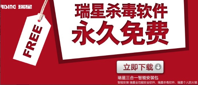 3月18日,国内最大的信息安全厂商瑞星公司宣布,从即日起其个人安全软件产品全面、永久免费——今后价格将不再成为阻碍广大用户使用顶级专业安全 软件的障碍。免费产品包括:2011年最新的瑞星全功能安全软件、瑞星杀毒软件、瑞星防火墙、瑞星帐号保险柜、瑞星加密盘、软件精选、瑞星安全助手等所有 个人软件产品。(下载链接:http://www.rising.com.cn/free/index.html)