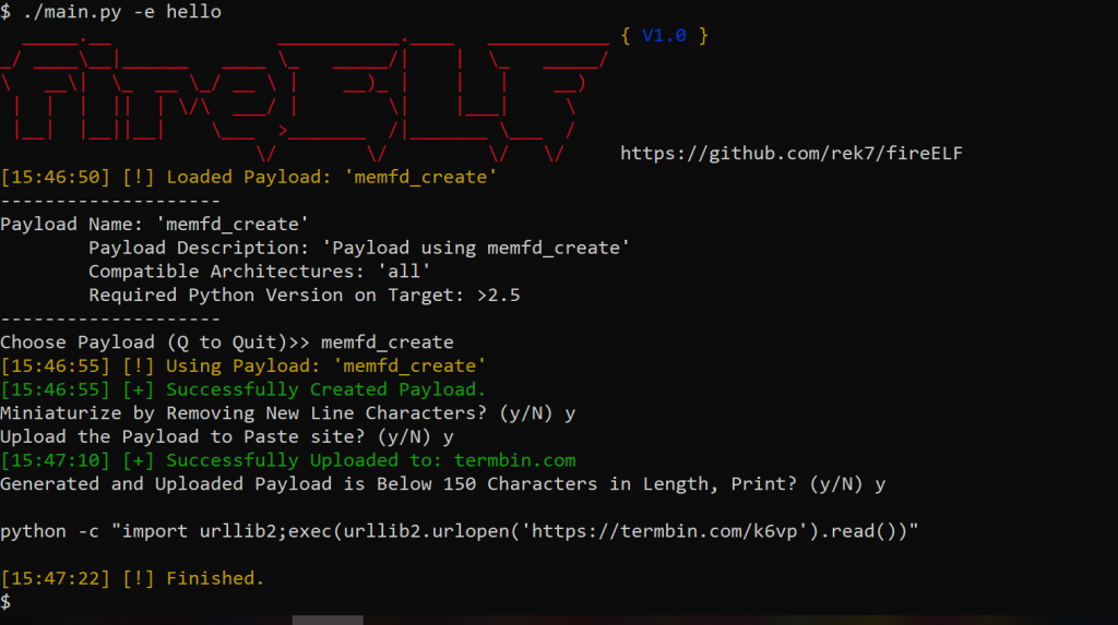 fireELF是一个开源的跨平台无文件Linux恶意代码框架,它允许用户轻松的创建和管理payloads。默认情况下附带了’memfd_create’,这是一种从内存中完全运行linux elf可执行文件的新方法。