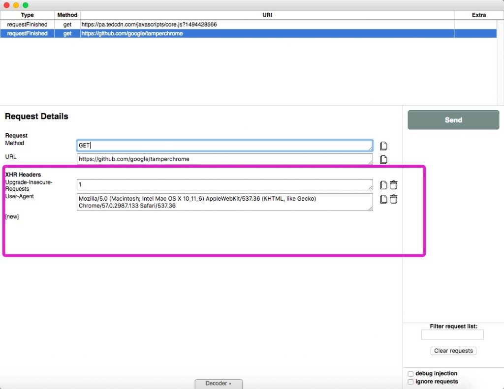 Tamper Chrome中的最后一个工具是重新请求。 这个工具非常有用,因为它允许修改POST请求的XHR Postdata(即post请求的具体内容,或将POST请求写入GET请求)。