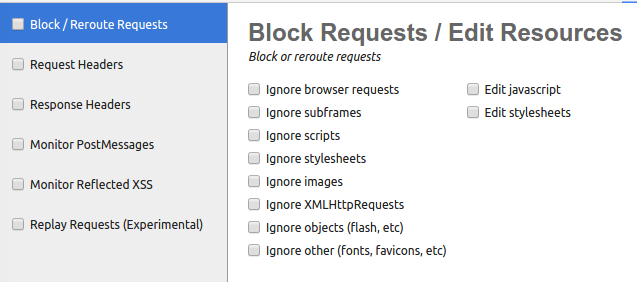 该工具允许阻止或重定向浏览器的请求,比如更改jQuery的版本。更改一些参数等等。可以直接通过更改URL并单击允许来实现。