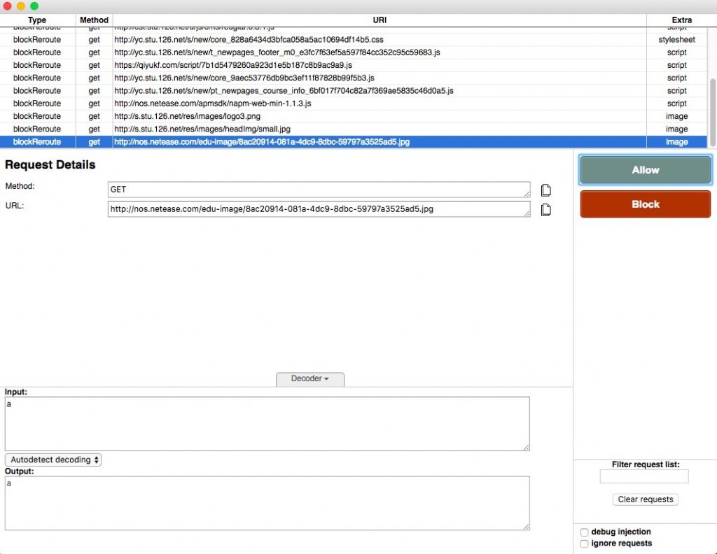 这里打开一个网站,通过分别点击Block和Allow可以分别阻拦和允许加载url内容。还可以单击编辑JavaScript和Css样式表,从而修改javascript和CSS代码本身。右下角底部可选择通过所有请求。