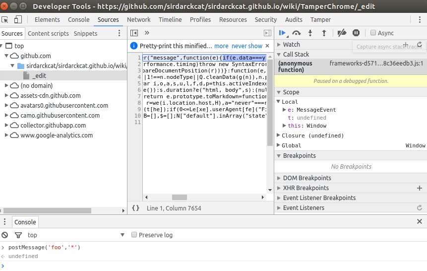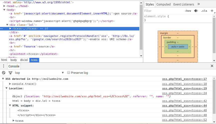当测试XSS时,您可以使用作为HTML元素(当然,它也可以作为一个属性,以Javascript变量形式存在,你也可以使用和)。Tamper Chrome会自动检测它,并显示它的具体位置,堆栈可跟踪它的生成位置。 非常适用于DOM XSS。