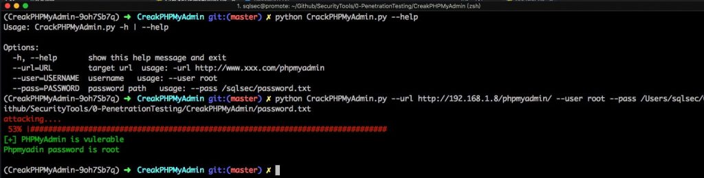 | 1 2 3 | git clone https://github.com/sqlsec/CreakPHPMyAdmin cd CreakPHPMyAdmin/ pip install -r requirements.txt |