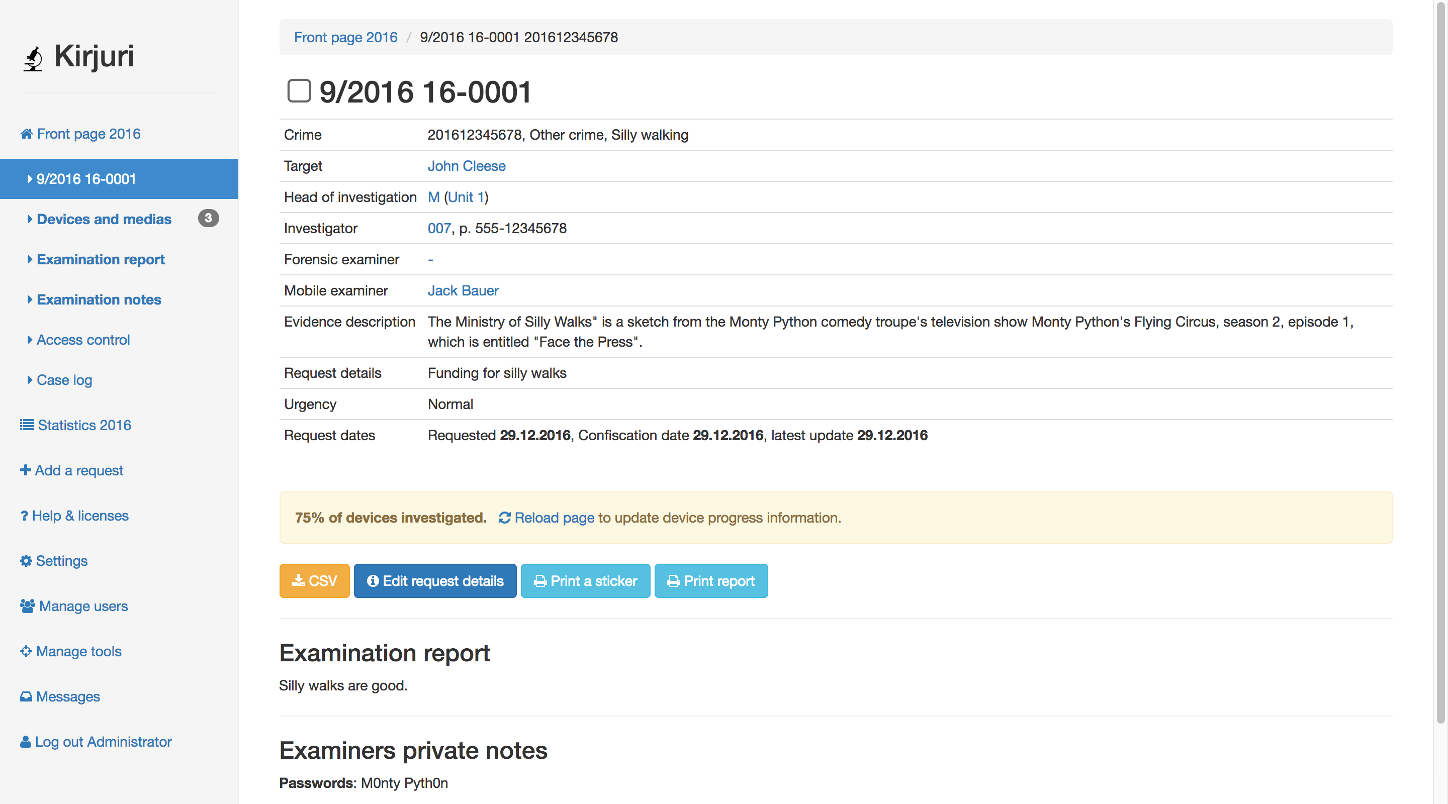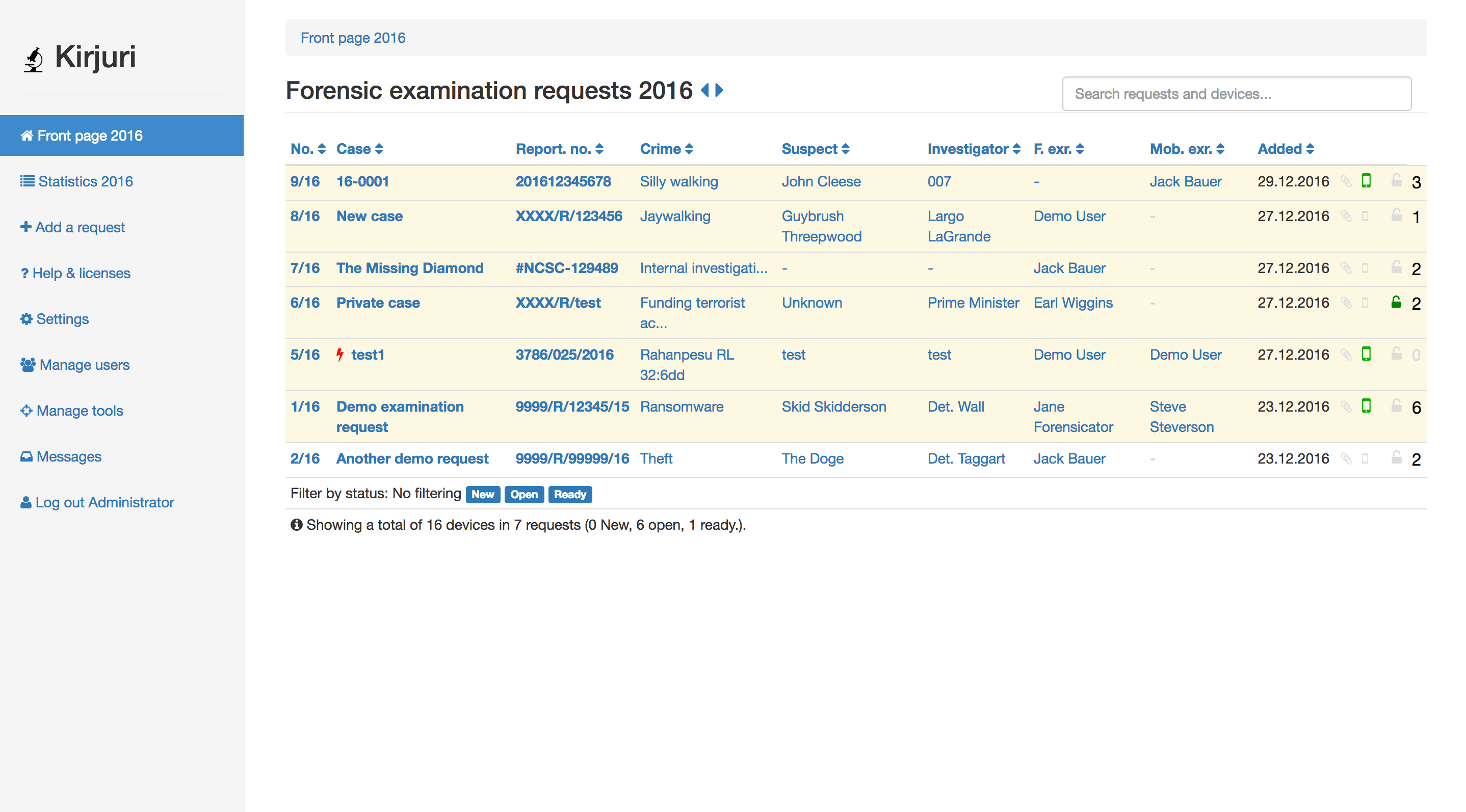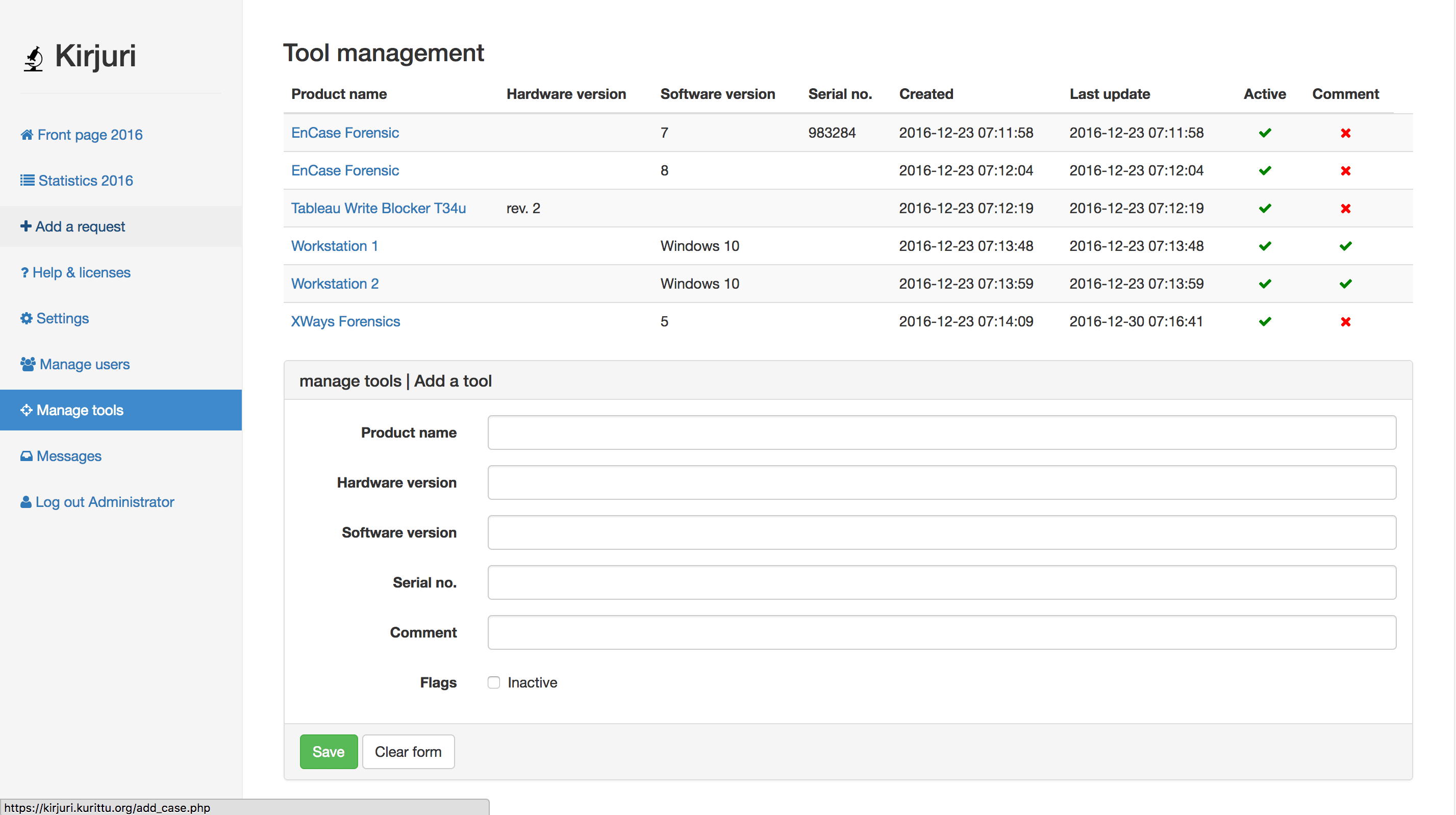 Kirjuri是一个数字取证/物理取证/证据项目管理系统。它是一个Web应用程序。旨在帮助法医团队管理,跟踪和报告交付用于法医检查的设备。它是在芬兰的首都和最大的港口城市赫尔辛基(Helsinki)警察局开始使用的内部工具。每年处理一千多种设备。由于不存在用于多用户证据设备管理/取证工具管理的现成软件套件,因此管理这些设备并跟踪所有这些材料的更改和位置被证明是一项艰巨的任务,它可以简化案例管理并提供帮助。Kirjuri基于php/mysql,需要PHP7。