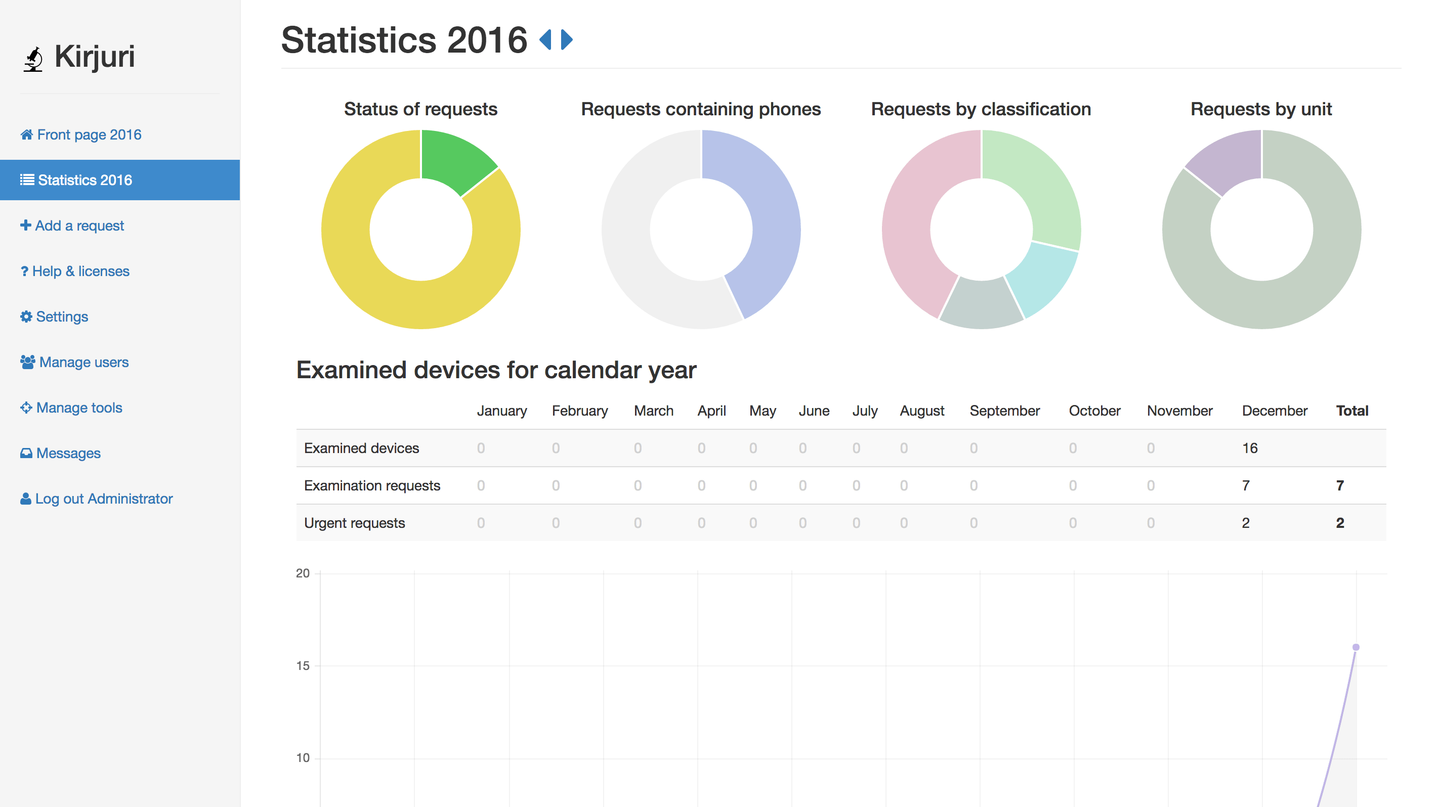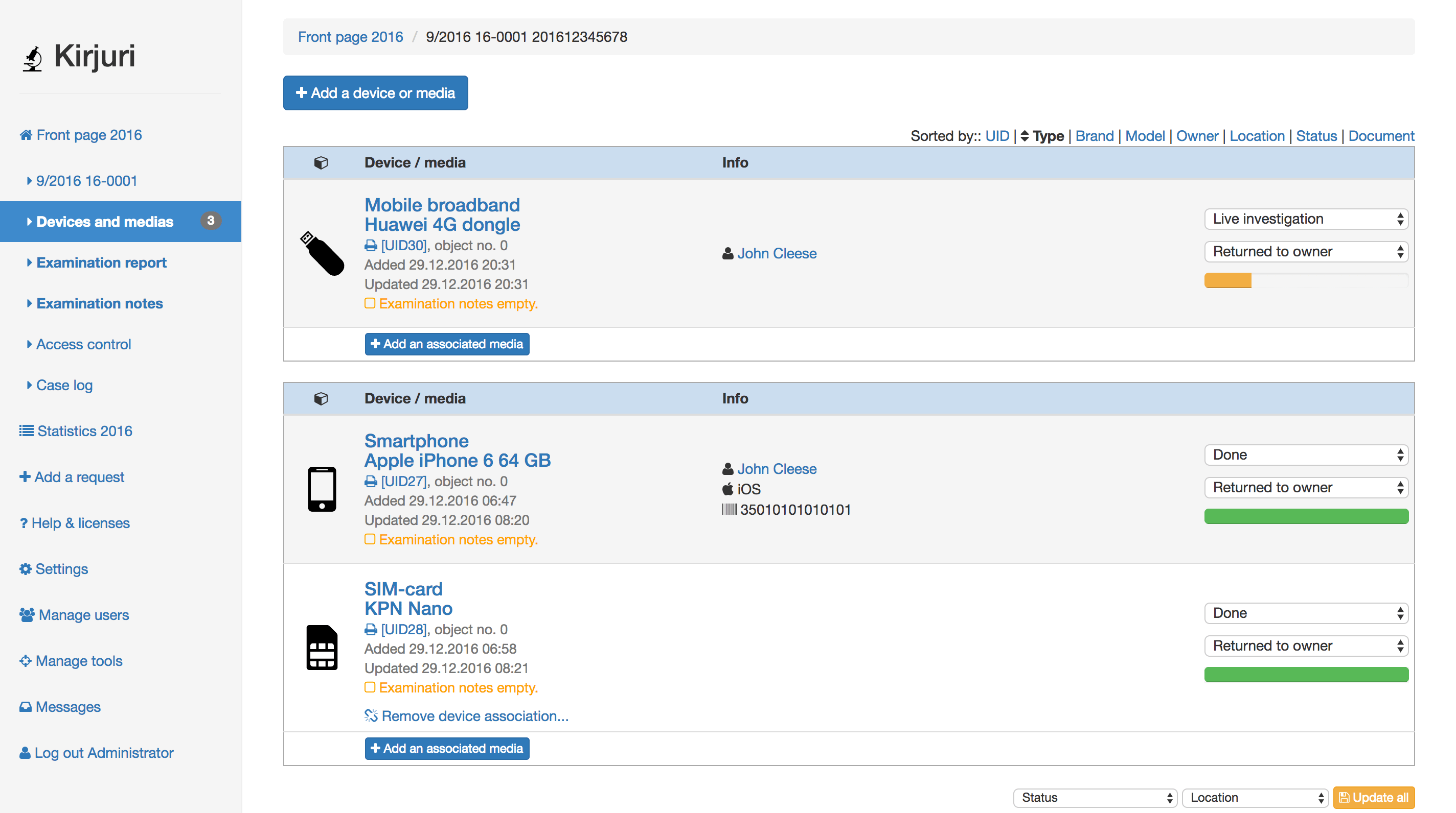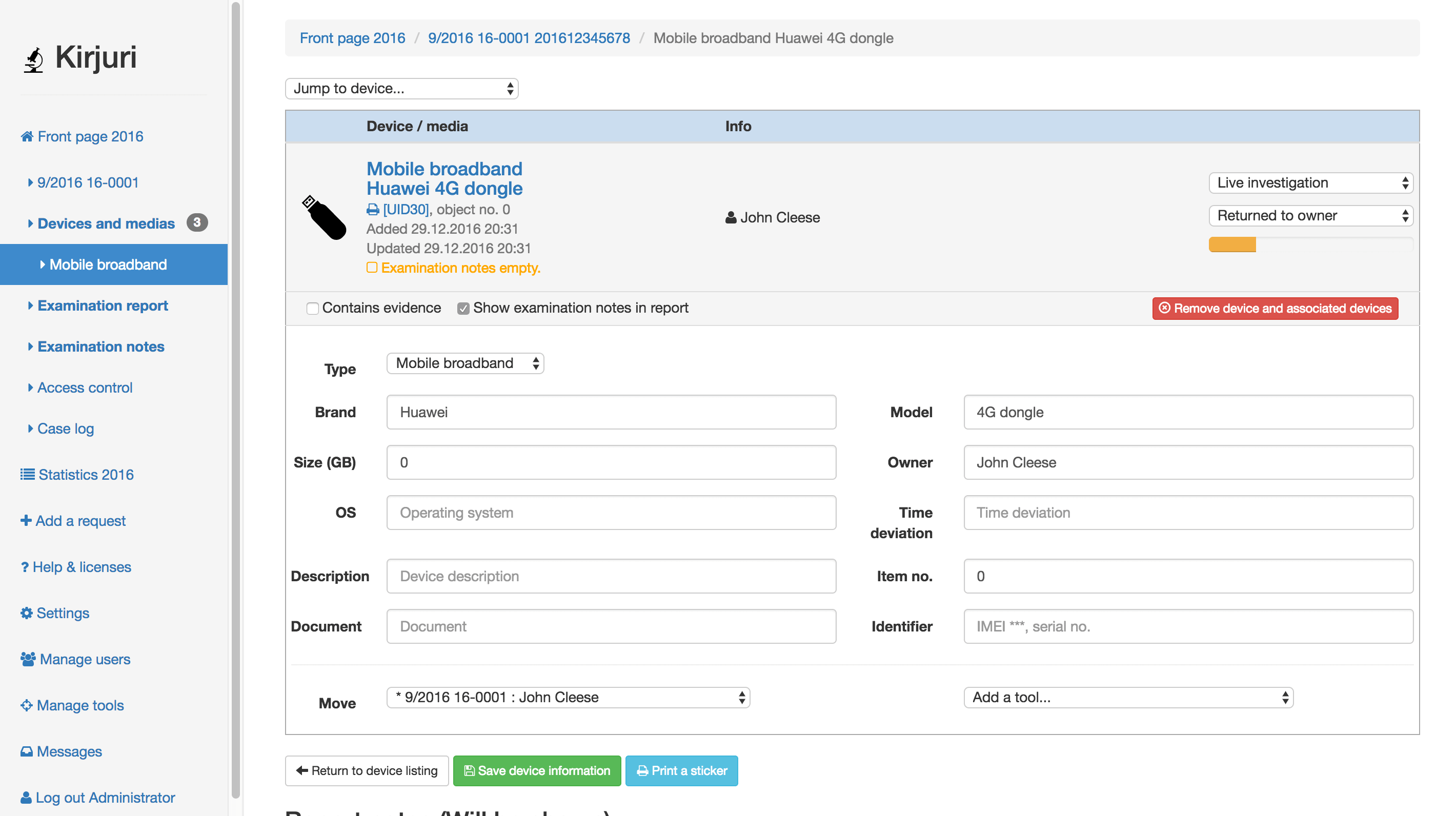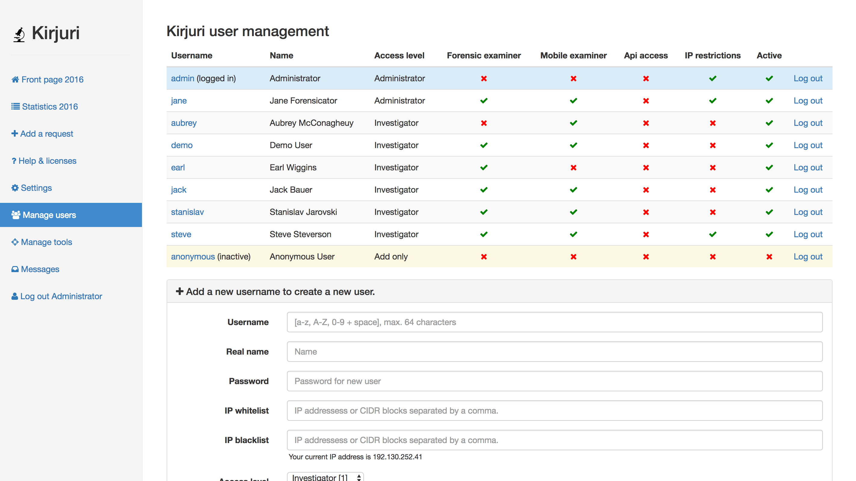 Kirjuri是一个数字取证/物理取证/证据项目管理系统。它是一个Web应用程序。旨在帮助法医团队管理,跟踪和报告交付用于法医检查的设备。它是在芬兰的首都和最大的港口城市赫尔辛基(Helsinki)警察局开始使用的内部工具。每年处理一千多种设备。由于不存在用于多用户证据设备管理/取证工具管理的现成软件套件,因此管理这些设备并跟踪所有这些材料的更改和位置被证明是一项艰巨的任务,它可以简化案例管理并提供帮助。Kirjuri基于php/mysql,需要PHP7。