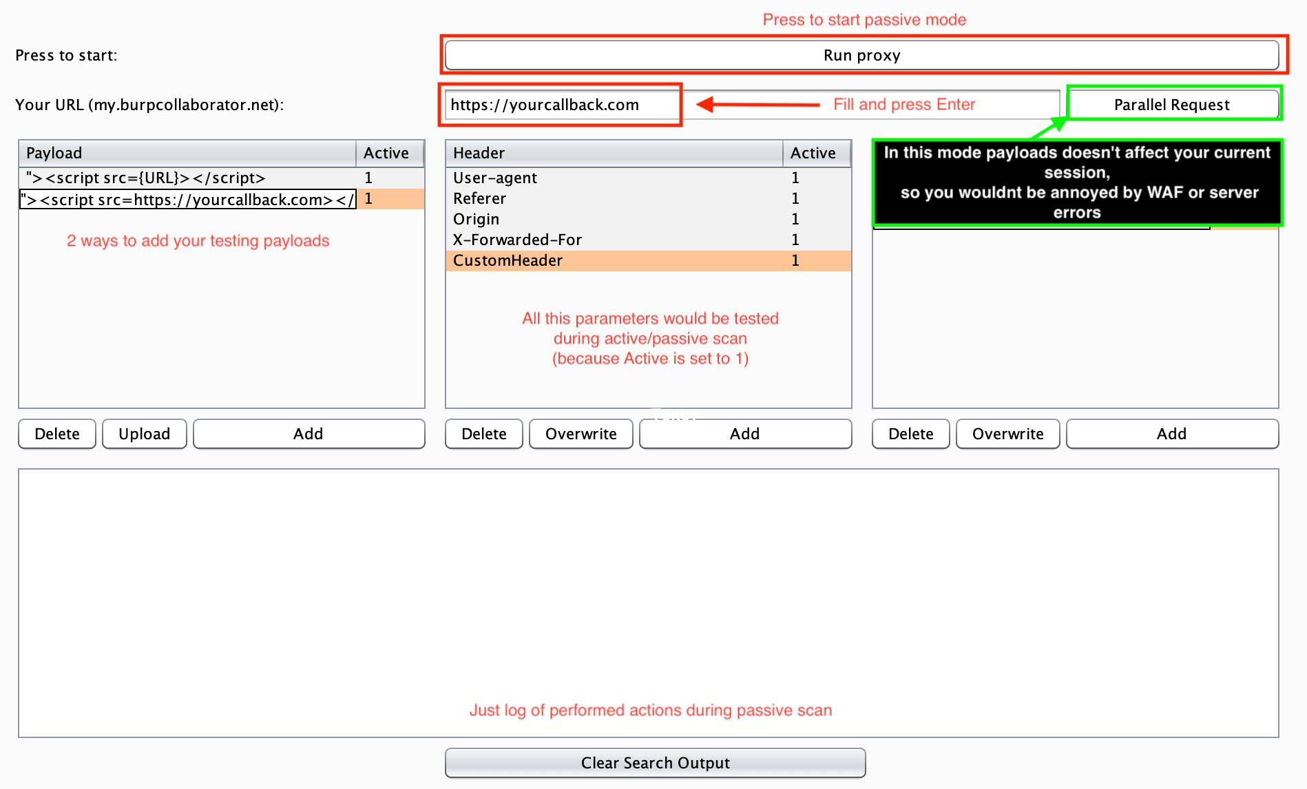 设置好之后,您需要用OOB-XSS向量填充Payloads表,以便扩展程序能够将您的Payloads注入到传出的请求中。请注意,您需要在Payloads中设置{URL}别名,因此扩展名将能够从“Your url”字段中获取数据并将其直接设置为Payloads。