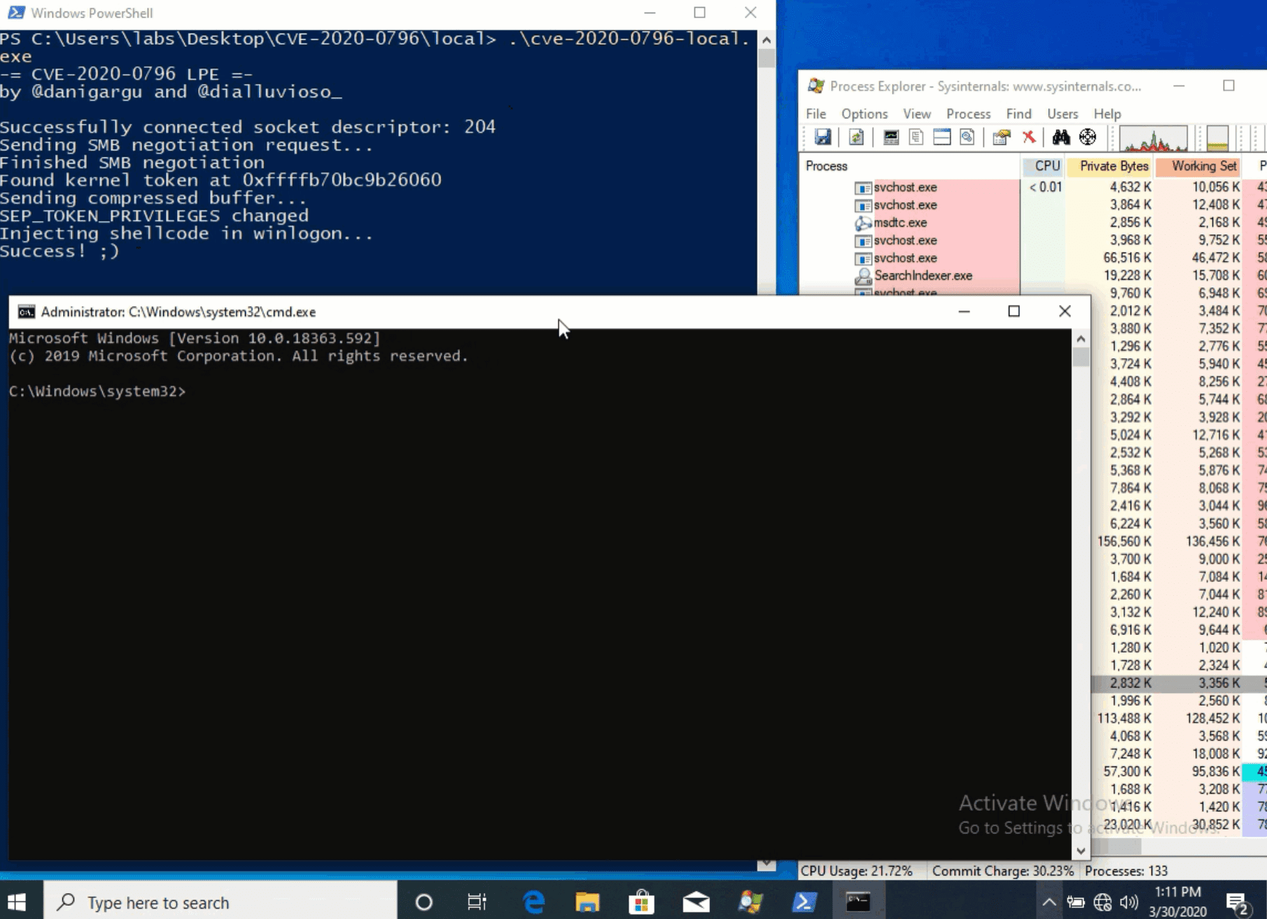 CVE-2020-0796-SMBv3 LPE exploit漏洞利用POC#SMBGhost