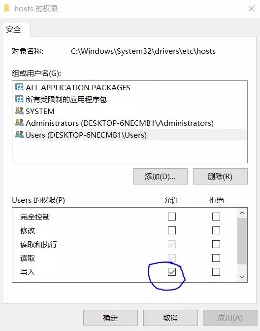 1、修改C:WindowsSystem32driversetchosts文件的权限,指定可写入:右击->hosts->属性->安全->编辑->点击Users->在Users的权限“写入”后面打勾。如下: