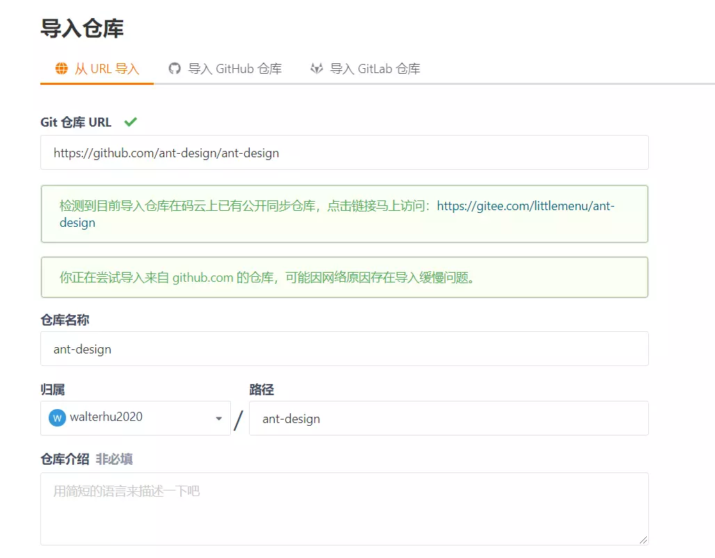 在导入页面中粘贴你的Github仓库地址,点击导入即可: