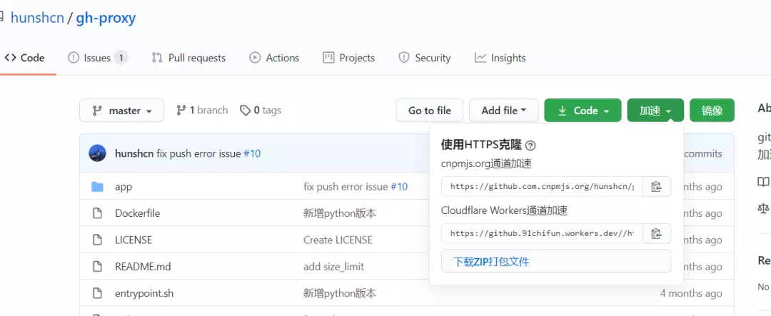 以上网站为演示站点,如无法打开可以查看开源项目:gh-proxy-GitHub(https://hunsh.net/archives/23/) 文件加速自行部署。