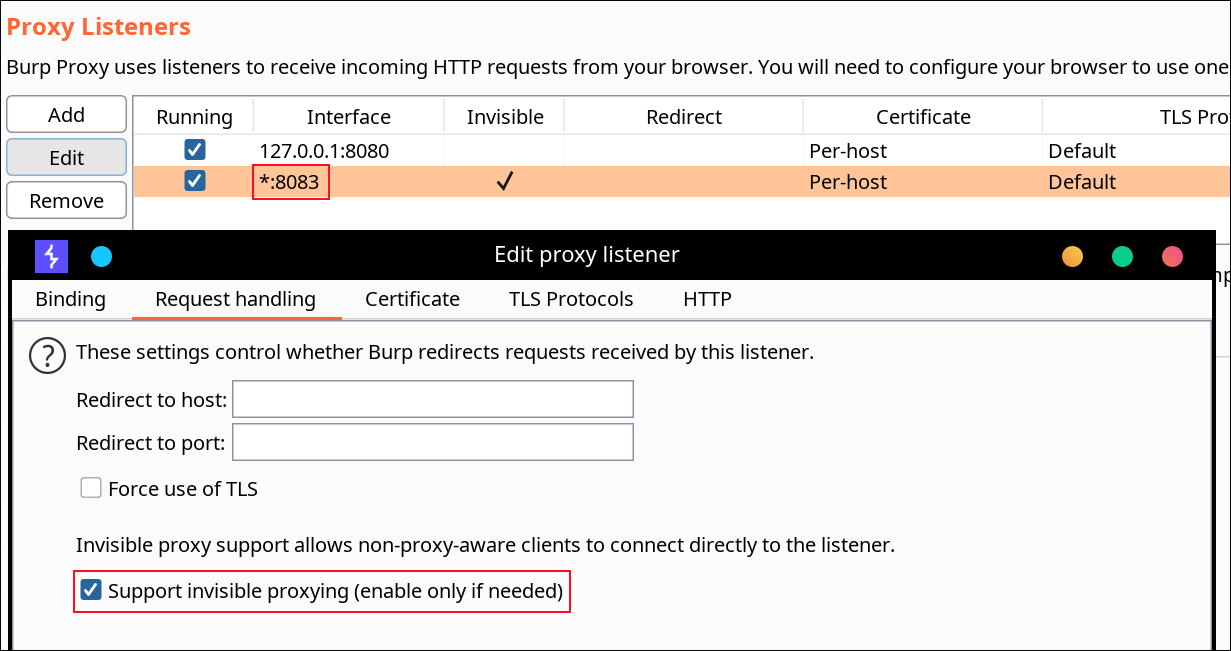 我们需要制定Burp Suite代理服务器的IP地址,且需要跟运行了目标Flutter应用程序的设备处于同一网络总。接下来,我们还需要配置代理(BurpSuite -> Listener Proxy -> Options tab):