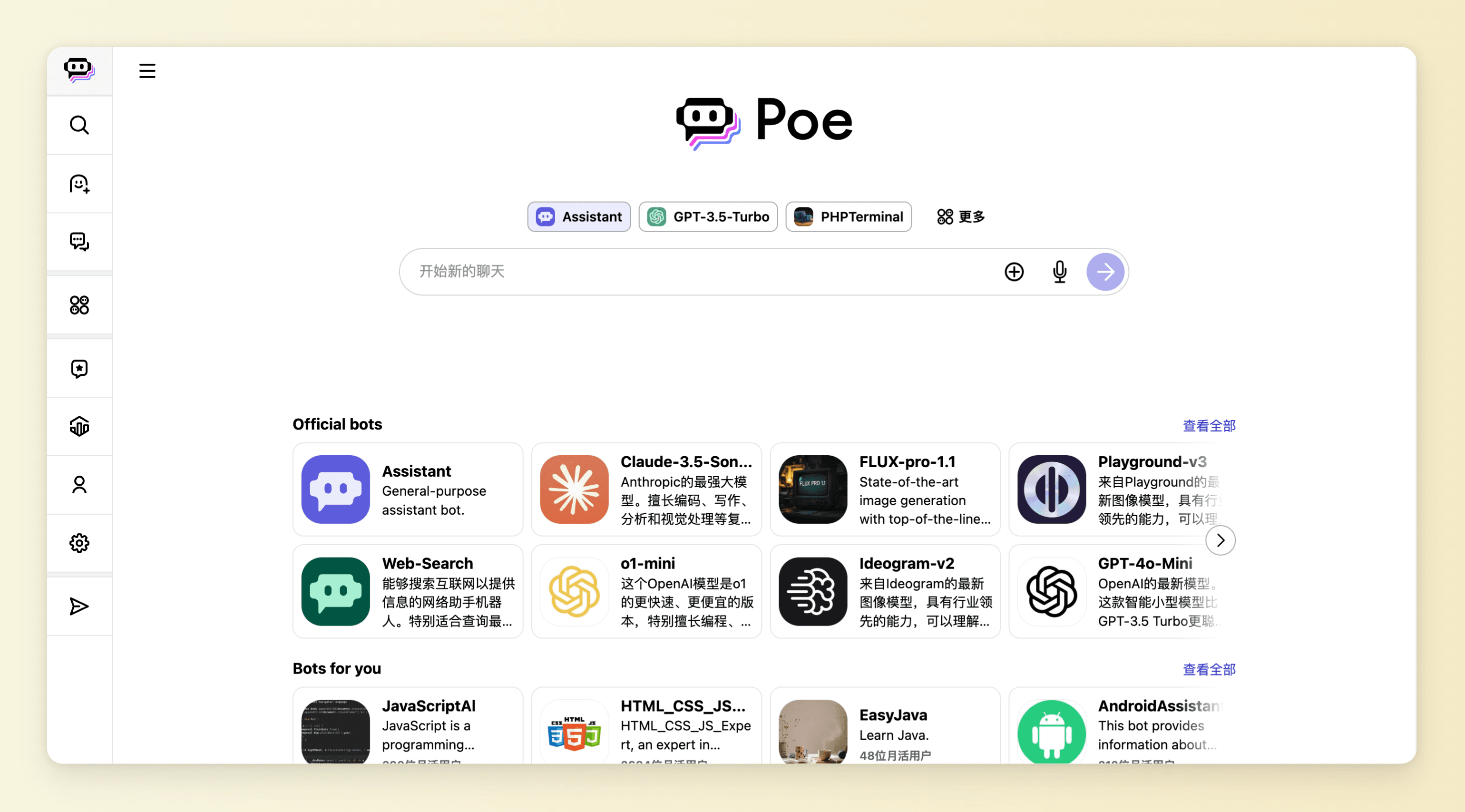 Poe 是一个可供人们提出问题、获得即时答复并与各种人工智能机器人进行对话的大型平台,适用于 iOS、Android、 MacOS、Windows、 和 web1 等系统。