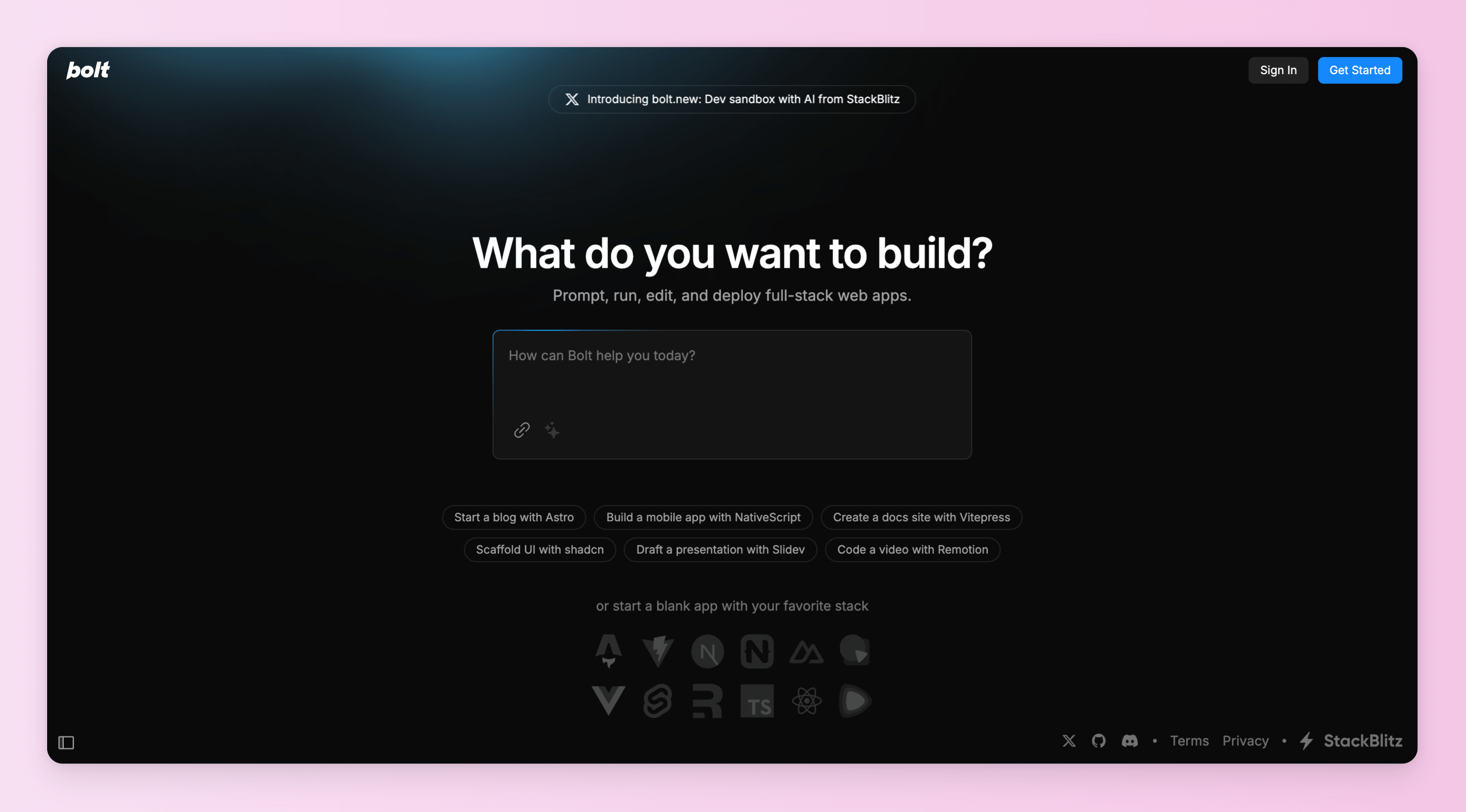 StackBlitz 推出的Bolt.new 可以直接在浏览器里面 Prompt、运行、编辑、部署全栈应用,「Prompt, run, edit, and deploy full-stack web applications」,通过 WebContainers 提供支持的浏览器内开发环境集成来弄的。