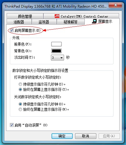 解决:系统Windows 7旌旗版,桌面右键-屏幕分辨率-高级设置-屏幕显示,把“启用屏幕显示”选中应用,OK问题解决,上图。