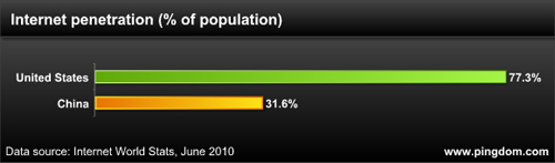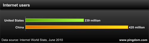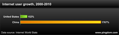在这一点上,我们可以回顾一下过去的数据。在2000年的时候美国有95,000,000网民,在2010年为239,000,000.另一方面,中国在此期间的网民数量由22,000,000增长到420,000,000.对比这两个数字相信就知道差别了吧。