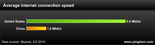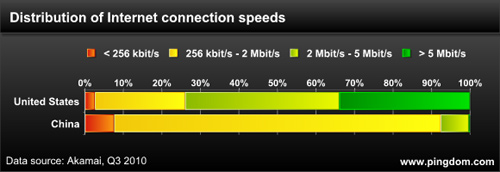 造成这种差别的原因很清楚,当你看到网络连接连接速度是如何分布的(如下图)。在美国,34%的互联网连接速度超过5 Mbit /秒,而在中国,只有0.4%达到这一速度。