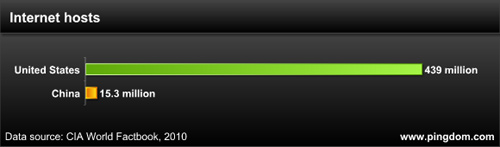 上图是由CIA提供的数据,显而易见得是:美国几乎提供比中国多28倍的网络服务器。我们不知道这些数据时怎样得到的,但是已经能从一方面反应两国之间在网络拂去其方面的差异了。