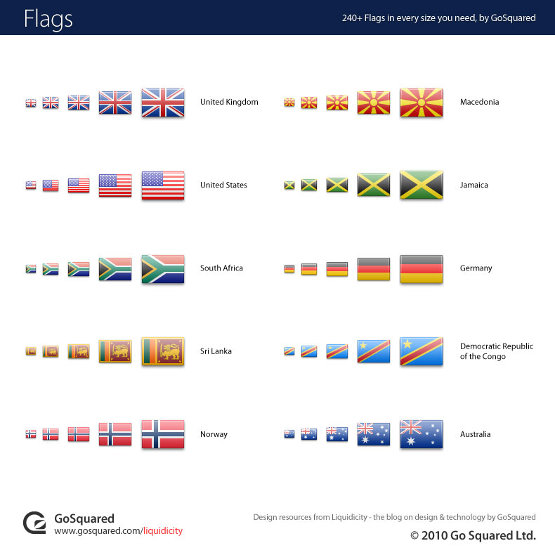 Introducing our latest icon set – 2400 Flags. We’ve created a flag for every major country in the world, plus a few more. And we’ve created them in several sizes so they’ll look great no matter where you’re using them – 16×16, 24×24, 32×32, 48×48, and 64×64. We’ve also provided them in 2 variants – as flat and standard, and with a lovely glossy finish.