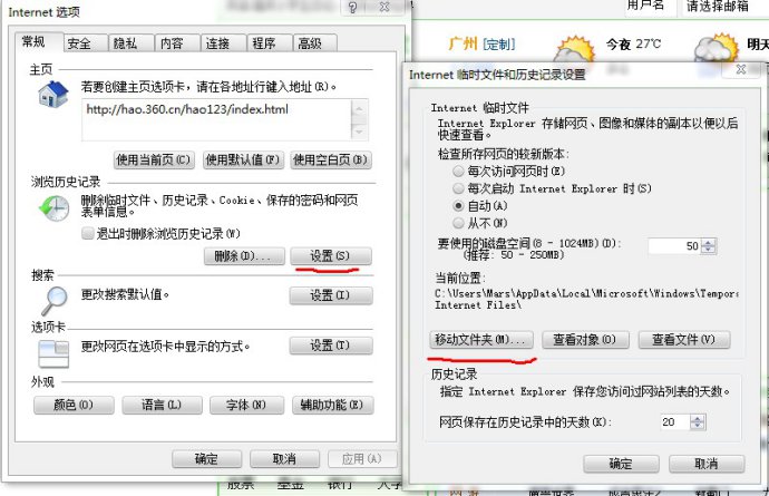 1、更改ie临时文件存放位置。打开ie浏览器----工具---internet选项-----常规----设置,弹出框框,选“转移文件夹”,转到其他盘。如下图