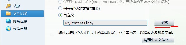 2、更改qq缓存文件位置(此步骤很重要)。打开系统设置-----文件记录,选“浏览”,如下图