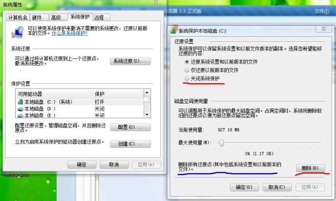 3、关闭系统保护:计算机-> 右键“属性”-> 系统保护 -> 配置,找到C盘的系统还原关闭即可。也可以不关闭这个功能,但是你必须定期删除一些还原点,因为还原点占的空间非常大。如果你备份了系统就可以关闭这个功能。