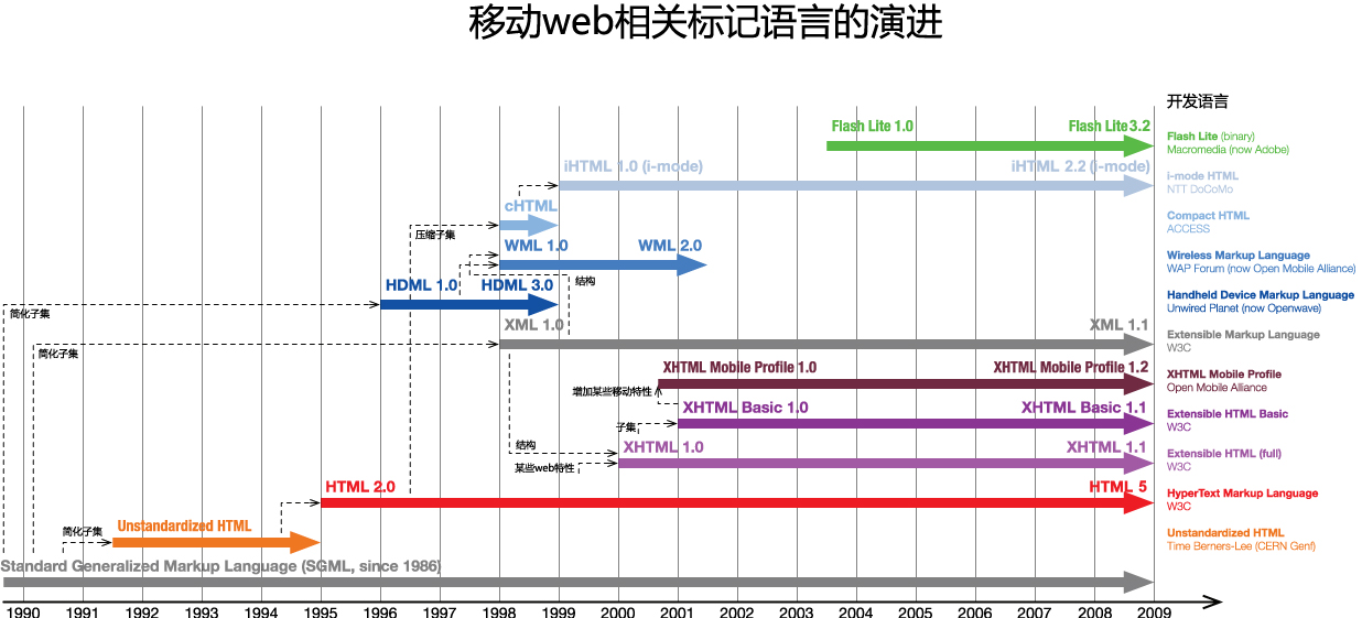 这张图形象的展示了标记语言的发展历程,包括移动网站标记语言。