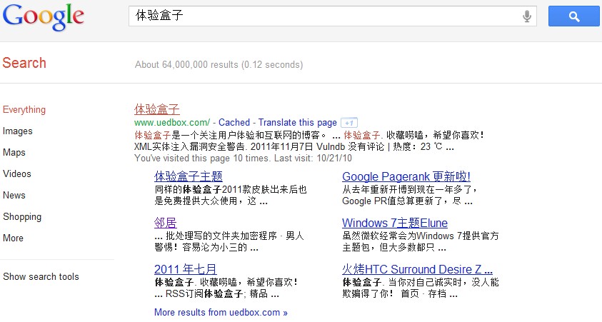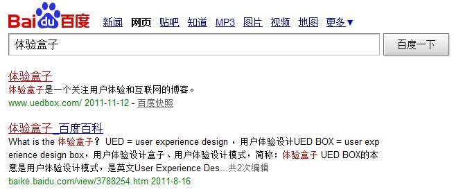 百毒下成功把我自己之前编辑的“体验盒子”词条超掉,这个问题头疼了我很久,为什么百度老是把我那词条排在第一位,而我博客却第二位,但今天总算得已解决,哈哈。
