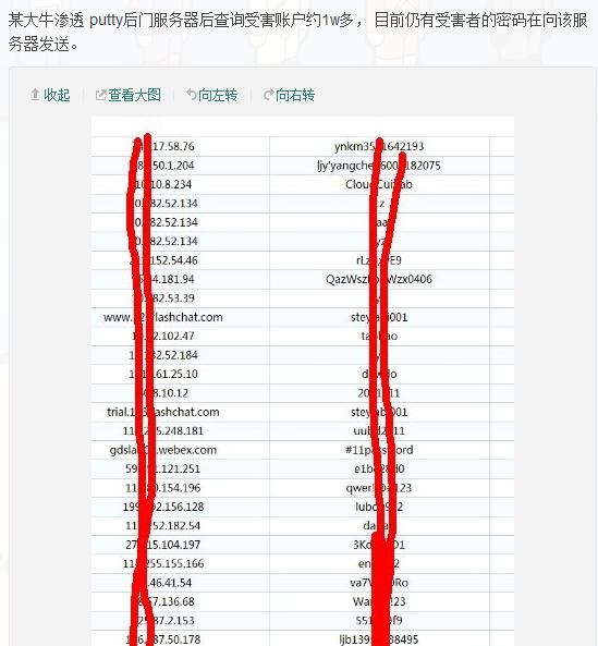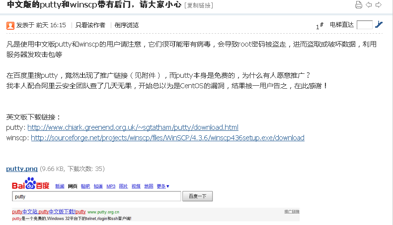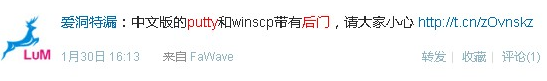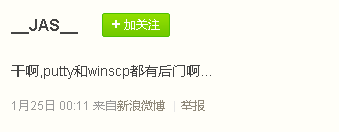 1月25日:新浪微博有网友发布消息称putty和winscp中装有后门程序,但该条微博并未提及后门程序的类型及其技术细节,而且消息也未被过多的人所重视,目前无法确定该条微博是否与此次事件有关联: