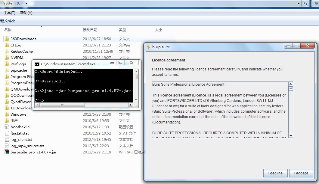 3、解压压缩包得到burpsuite_pro_v1.4.07+.jar,打开CMD中转到目录