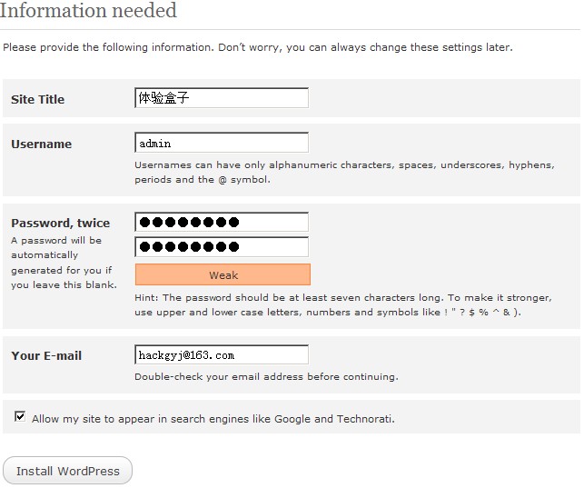 安装新的WordPress博客时,新增了自定义用户名和密码的字段。