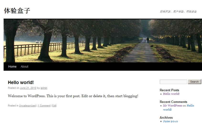 安装成功后,打开博客首页看看。WordPress使用了一个全新的默认主题 – Twenty Ten。 这个主题激活了很多WordPress 2.9版本以后的新功能。比如WP3.0的导航菜单,自定义编辑器样式,自定义背景,自定义头部图片,2.9就有的文章缩略图等。