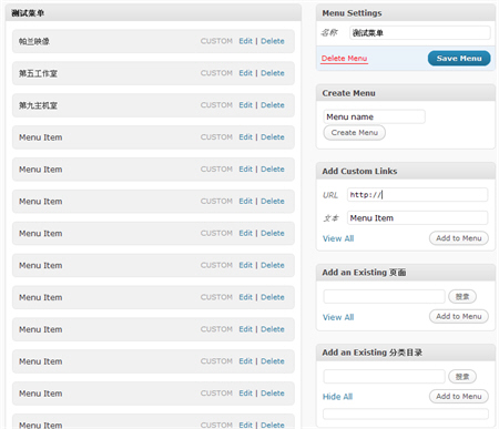 相比之下,新增的后台导航菜单配置就实用许多,通过这个功能,你可以在后台新增一个或多个菜单,并且每个菜单可以混合添加已经存在的页面和分类,或 自定义的链接。