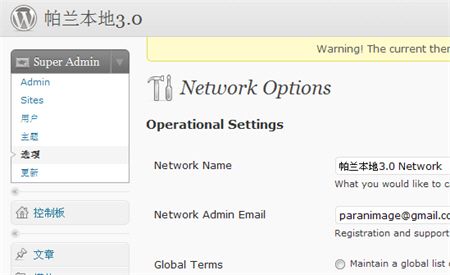 激活该功能后,会出现一个超级管理员的菜单。在这里,你可以新增用户或子网站,配置Network的各种选项,配置哪些主题可被子网站所使用,子网站可具 备哪些权限,什么权限的可以创建子网站等等等等。