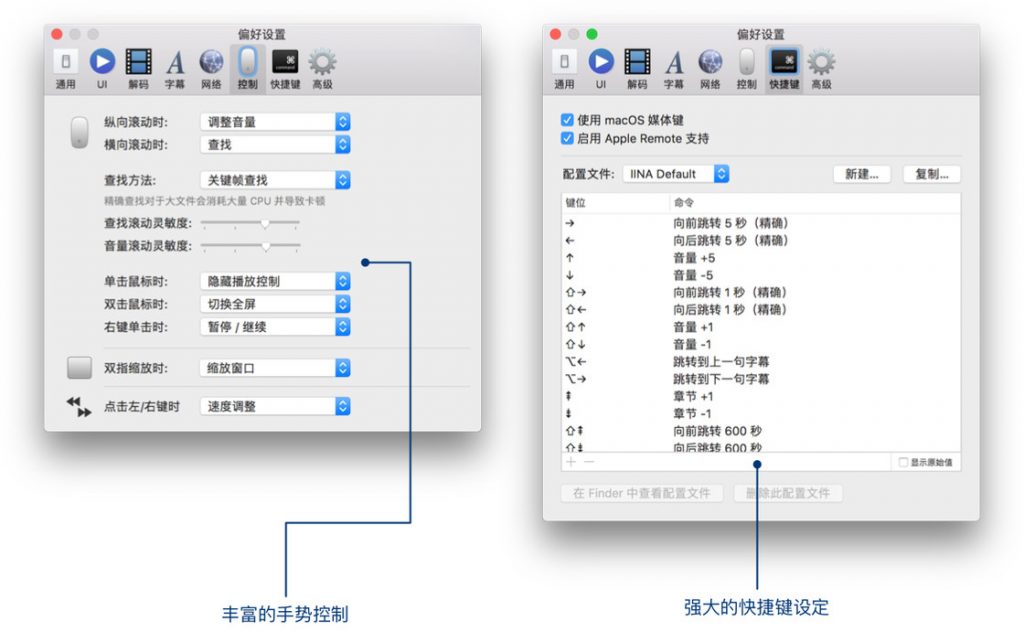 从alpha版开始使用到现在的Build版,体验一直都非常棒,它几乎支持所有流行的格式,其功能上完全不输Windows上的老牌播放器。 IINA 使用了 mpv 作为自己的播放内核,从血统上就继承了极其强大的解码能力,而且相较于同是使用 mvp 的 MPlayerX,IINA 采用更加高效的模式,并且使用原始屏幕分辨率进行渲染,具有更快和更稳定的解码效果。而另一个好处就是,熟悉并喜欢 mpv 的高端用户可以直接调整或者载入 mpv 配置,实现高级定制。