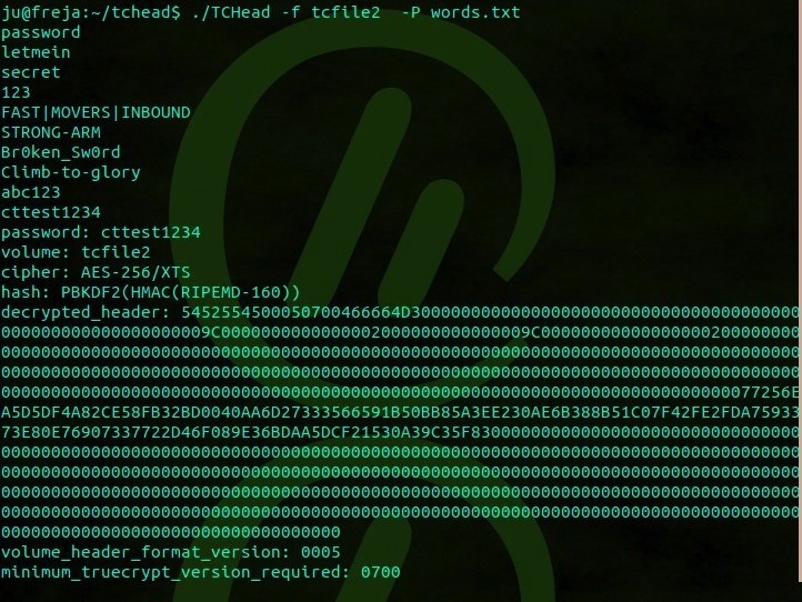 TCHead -f name_of_volume.tc -P words.txt --hidden