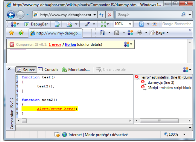 4、在Ie中输入:http://www.my-debugbar.com/wiki/uploads/CompanionJS/dummy.htm,然后点击click me链接,如果左上角弹出一个小错误提示或下面控制台出现了错误信息提示,就说明您已经安装成功了。