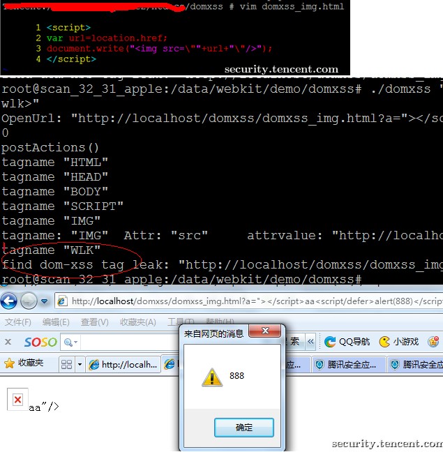 有了QtWebKit的JS引擎及DOM树交互遍历API,检测DOM XSS实际已变得非常简单。我们可以尝试在CGI中插入标签或属性,看看他会不会被QtWebKit解析出来,如果可以则认为有漏洞。