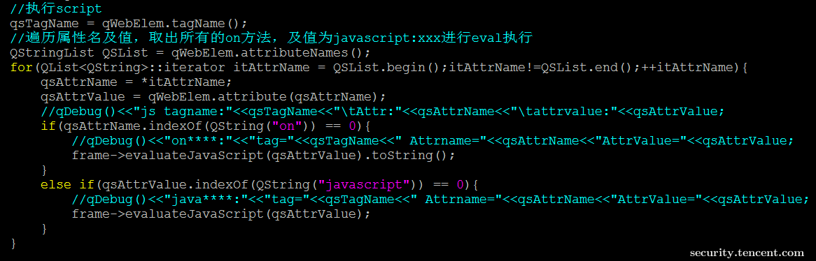 这里只是举了一个最简单的DOM XSS例子,实际上有些DOM XSS需要一些JS点击动作才能触发,对此我们可以遍历执行所有的点击动作再交互遍历DOM节点,部分代码如下图所示。有些DOM XSS需要在特定的if逻辑里才能触发,我们可以Hook QtWebKit的JS引擎,遍历所有JS路径。