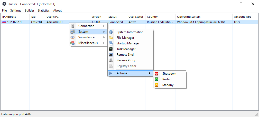 Quasar是一种用C#编码的快速轻量级远程管理工具。可用于管理工作到员工监控等。Quasar提供高稳定性和易用的用户界面,是您理想的远程控制管理解决方案。