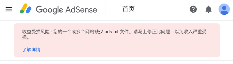 收益受损风险 - 您的一个或多个网站缺少 ads.txt 文件。请马上修正此问题,以免收入严重受损。
