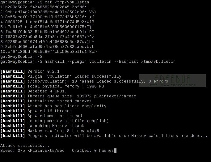 Hashkill是一个开放源代码的Linux下的hash密码破解工具,它使用了OpenSSL,目前支持4种破解方法(字典、蛮力、混合、markov)和31种不同类型hash的插件(md5, sha1, phpbb3, mysql, md5 (unix), des(unix), sha(unix), vbulletin, smf等)。支持NVIDIA和ATI的GPU破解,并且支持多线程和会话保存和恢复。