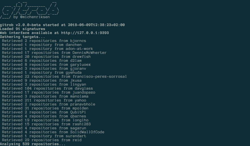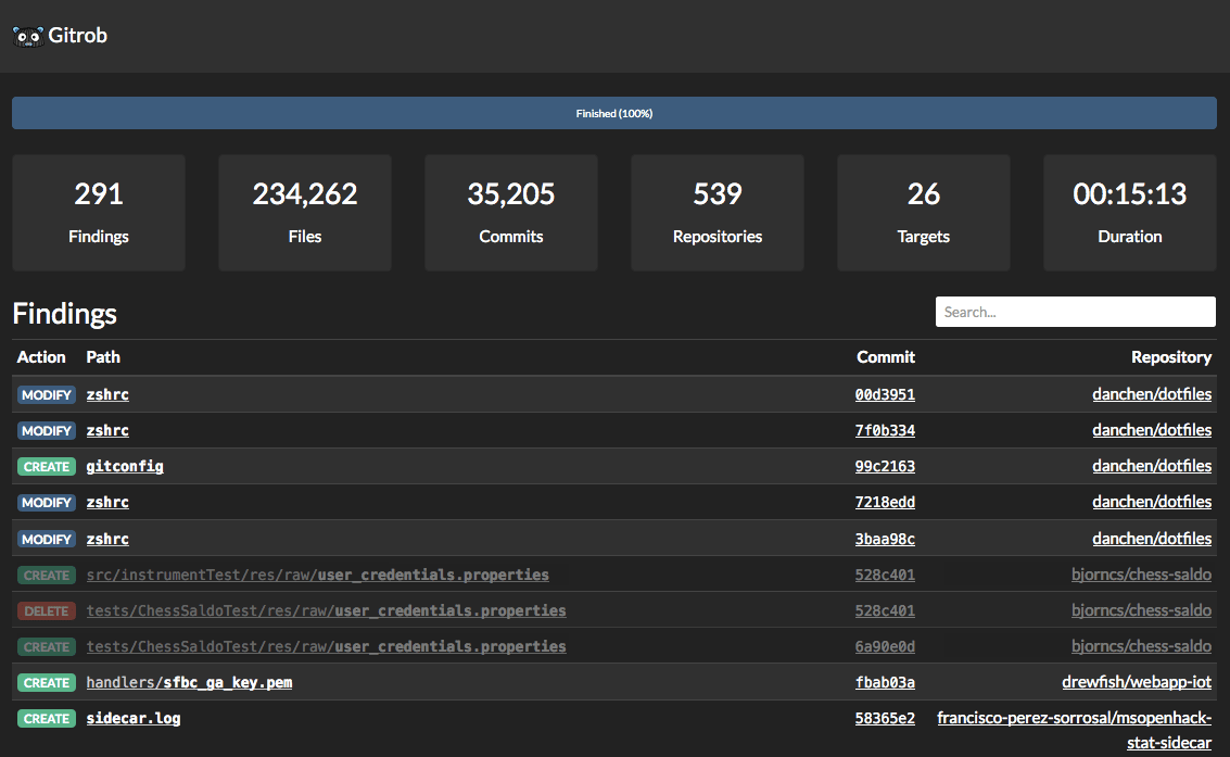Gitrob是一个Github潜在敏感信息泄漏扫描工具。Gitrob将属于用户或组织的存储库克隆到可配置的深度,并遍历提交历史记录/标记与潜在敏感文件的签名匹配的文件。调查结果将通过网络界面呈现,以便于浏览和分析。