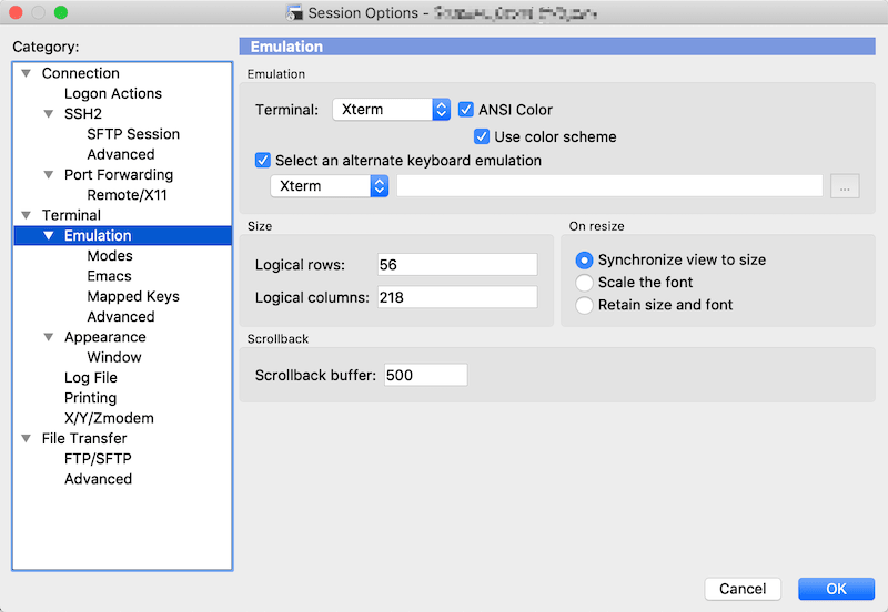 其中Terminal选择 【Xterm】,勾选【ANSI Color】和【Select an alternate keyboard emulation】