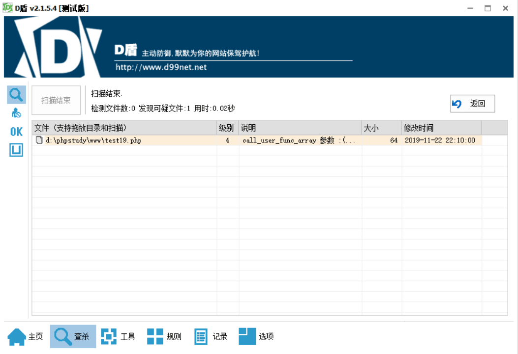 使用最新版本的D盾查杀如下,报了4级可疑。