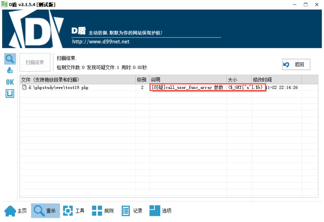 好了,已经正确表明D盾把回调函数call_user_func_array拉黑了,接下来将是我的重点,介绍如何绕过这种检测。
