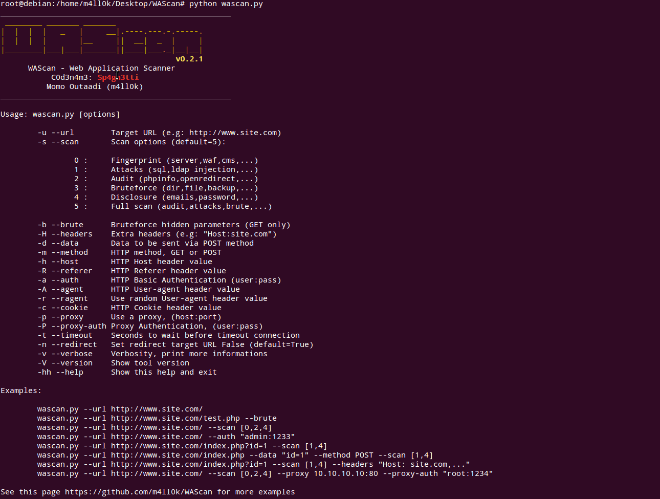 | 1 2 3 4 | $ git clone https://github.com/m4ll0k/WAScan.git wascan $ cd wascan $ pip install BeautifulSoup $ python wascan.py |